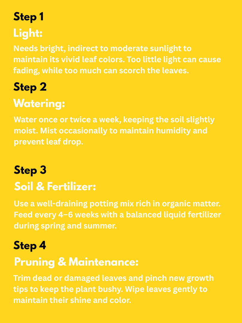 | Light Requirement | Bright, indirect sunlight (needs good light for vibrant color) |