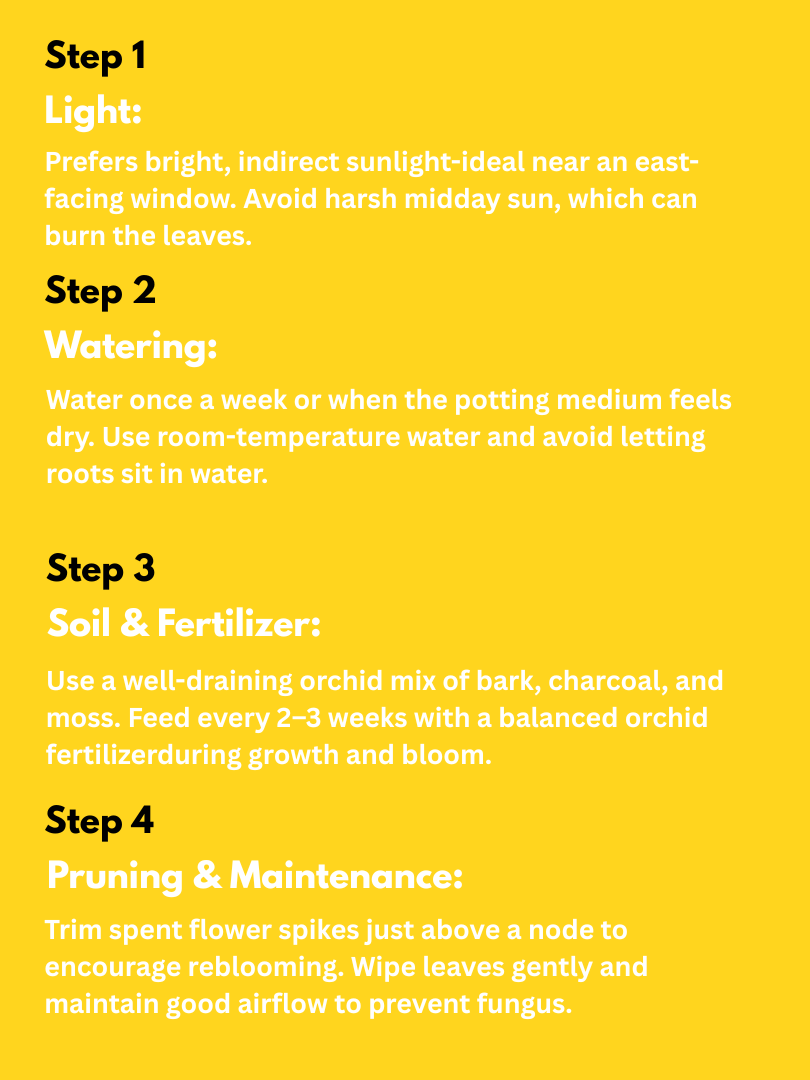 | Fertilizer | Orchid fertilizer every 2–3 weeks (growing season) |