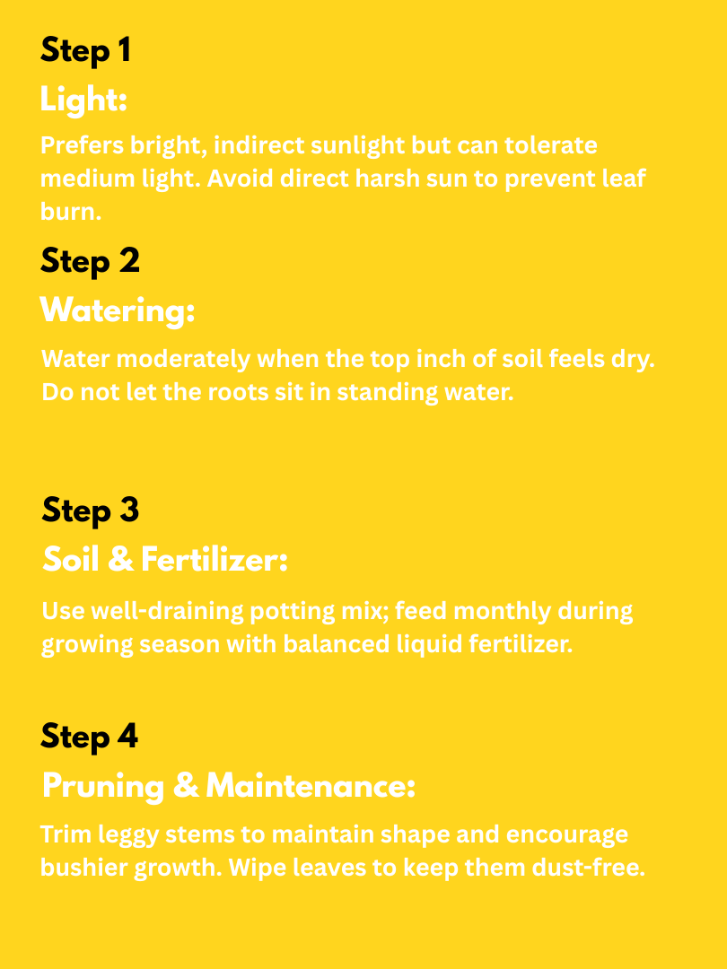 | Light Requirement | Bright, indirect sunlight (tolerates medium light) |